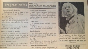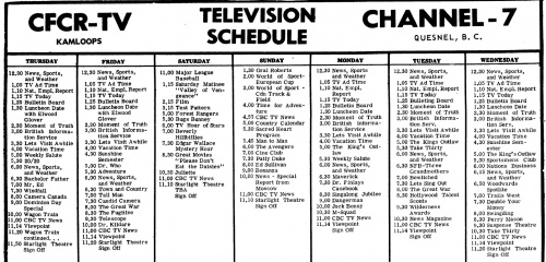 TV listings have been obtained from the newspapers Globe and Mail, Toronto Daily Star, Winnipeg Free Press and CBC Times. The CFCR listings are from the Cariboo Observer. (With grateful thanks to Randy Howell for supplying these.)