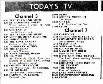 • BRISBANE: The series started on Friday, 22 January 1965. The run ended on Friday, 29 April 1966. If there was a repeat of D during December 1965/January 1966, as in other regions, we have not been able to find any listings. Chances are Brisbane never saw the serial repeated. (Although there is a very remote possibility that all seven episodes aired back to back one day as a replacement for cricket that had been cancelled due to rain (possibly on 11 December 1965), such a scheduling move would have been highly uncharacteristic of the ABC...)