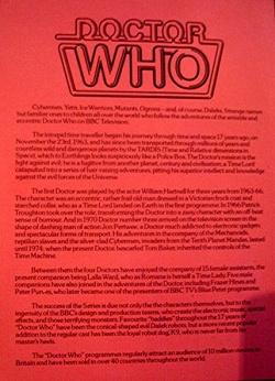 - ... the BBC sells the programme to thirty-six different countries. Doctor Who is easily Britain's most popular TV export. [page 29; A Day with a TV Producer; Graham Rickard; Wayland (Publishers) Ltd; 1980; from material researched in April 1980]