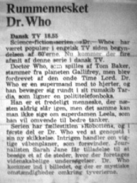 | − | + | Although the above article, and those below, feature photographs of Mary Tamm (as Romana) and K9, none of their stories screened in Denmark. The Doctor is compared to other superheroes such as '''Superman''', and is said to be on the run from the evil Time Lords. | |