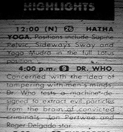 • December 1972: The debut screening of the Jon Pertwee stories is listed in the Washington Evening Star TV guide for the week starting Monday 4 December 1972, screening weekdays at 4.00pm. The synopsis in the HIGHLIGHTS section of the paper suggests that the first serial was The Mind of Evil. However, despite being listed in that same time slot Monday through Friday, Doctor Who was not listed the following week. Nor the week after that – in fact, it wasn't listed again until June 1973! It seems that the series had been scheduled but for whatever reason it was pulled at the last moment.