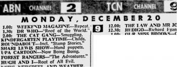NOTE ABOUT REPEATS: Serials A, B, C, E, G, K and L had all been rated "A" and therefore could not be re-run in the early afternoon slots. Only part one of J had an "A" rating, but the full serial did get a re-screening. In July 1967, the ABC's prints of H, J, K and L (still exhibiting the censor cuts) were sent to New Zealand…
