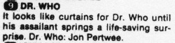 - 16 July 1973: The 13 story / 72 episode package of Jon Pertwee stories begins, although TV Guide doesn't catch on until the second week.
