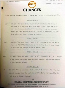 • January-February 1988: For the 25th anniversary, the following stories were shown as omnibuses one per week (Saturdays, at 10pm) in the spring: An Unearthly Child (the only William Hartnell story to air), The Krotons (the only Patrick Troughton story to air), Carnival of Monsters, Logopolis, The Five Doctors, and then Time and the Rani (the only Sylvester McCoy story to air). AETN claimed during their pledge breaks to be among the first American stations to Time and the Rani. [Ed. note: they probably were the first]