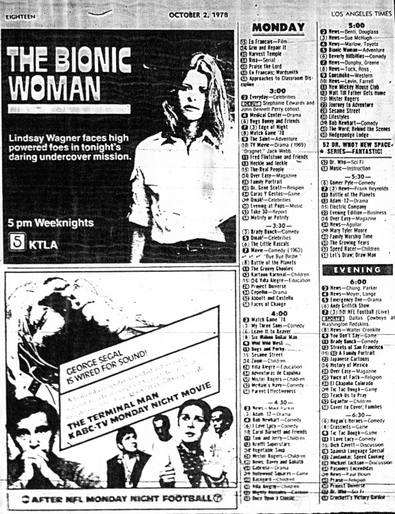 Listing for the first airing on KBSC, 2 Oct 1978, 5.00pm and again at 6.30pm (Los Angeles Times)