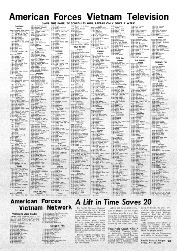 The Stars and Stripes did publish very comprehensive TV schedules for AFKN (Korea), AFVN (Vietnam), and the FEN stations (Japan), during the 1960s and 1970s (the weekly schedule for AFVN alone took up an entire page in 1970! (see example at right)), whereas the Philippines network AFPN had only a few listings published. The Iceland and Germany listings were also very comprehensive.