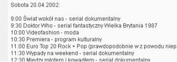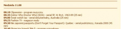 An unofficial site by fans of Polonia 1 has quite an extensive online "archive" of material, including lists and examples of daily schedules of the various programmes the station aired over the years (see POLONIA 1, as well as a general Polish TV listings "archive" at POLISH TV LISTINGS), but despite our searching in both sites for references to Doctor Who, Doktor Who or Doktor Kto, none could be found. Of course, not being able to read Polish doesn't exactly help!