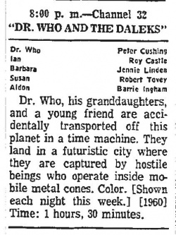 - 13-18 April 1969: The first Peter Cushing movie, "Dr Who and the Daleks" airs at 2.30pm on Sunday, with a repeat at 8.00pm each night that week.