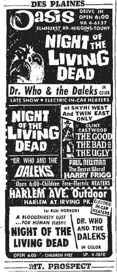- October/December 1968: Dr Who and the Daleks is re-released in selected theatres (such as in Chicago, Illinois), on a double bill with the debut release of George Romero's Night of the Living Dead.