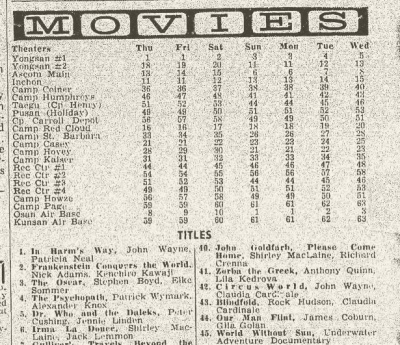 Listings have come from the European and Pacific editions of the US Military newspaper Stars and Stripes, accessed online at Stars and Stripes Archive. (NOTE: the archive is not free to view, but offers relatively cheap short term options.)