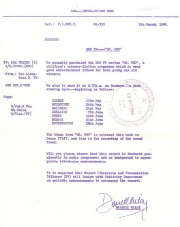 Based on the merits of those three sample episodes alone, and other supporting paper-based programme information material supplied by BBC Sydney, the audition team recommended a purchase, and the ABC confirmed to the BBC a few weeks later that they would indeed acquire the new series. (An inter-departmental memo confirming the purchase was issued on 20 February 1964 – see copy of this at right.)