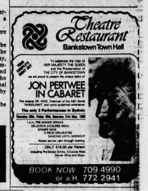 The ABC may have been planning to screen the 'new' colour third Doctor episodes to coincide with Pertwee's visit to Australia: the actor brought his "JON PERTWEE IN CABARET" tour for a multi-city engagement. The tour opened in SYDNEY, for three nights at the Theatre Restaurant at the Bankstown Town Hall from Thursday, 29 May 1980 until Saturday, 31 May. Tickets cost A$18.00, which included pre-dinner drinks, a three course meal and show. The tour then went to other cities around the country.