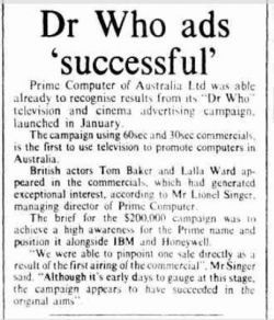 Starting in January 1980, and running for several months, commercials for Prime Computer of Australia Ltd (aka Prime Computer / Pr1me Computer) played at cinemas and aired on TV networks 7, 9 and 10. (Although it was the home of Doctor Who, the ABC could not show the adverts because it was a non-commercial station.)