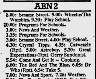 "Dr Who (Rpt)" 6.05-6.54pm (Horror of Fang Rock, parts one and two, 17 February 1984 (Sydney)