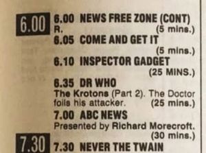 Satellite links also meant that broadcasts across Australia could now be fully synchronised, meaning that from 1986 onwards, Doctor Who was beamed from space! However, for a while yet the BRISBANE network continued to transmit a separate feed to all the remote centres not yet part of the satellite link-ups.
