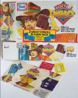 - Doctor Who iced confection – made by Streets in late 1981, these "Vanilla & Choc Chip Treats with a Choc Top!" came in wrappers featuring the fourth Doctor and K9, and each pack contained "2 great stencils / collect the set of 4". (Animated TV adverts for the iced lolly featuring the fourth Doctor and K9 aired on the commercial stations in early 1982, but not the ABC! See video below.)