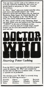 In 1965/66, Stanmark Productions Ltd attempted to produce a series of radio serials based on Doctor Who, to star Peter Cushing as the Doctor. A promotional brochure had been printed by August 1966, and in this document, it stated: "the television series "Dr Who" is currently being shown in the following territories: Australia, Cyprus, Malta, Hong Kong, Nigeria, Singapore, Rhodesia, New Zealand, Uganda, Gibraltar, Trinidad, Canada, Bermuda, Barbados, Aden, Ghana."