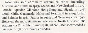 Between October 1991 and May 2003 (issues 180 to 331), DWM published a series of Archives, each an in-depth story analysis, researched and written by Andrew Pixley. These Archives (and the Archive Updates that featured in The Complete First Doctor, Complete Second Doctor, etc, series of specials published between 2001 and 2003) listed the then-known countries to which each serial was sold, such as the example shown here for Robot.