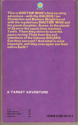 For many years the Target novelisations were readily available in Canada – the back covers of most but not all of the books bear a price in Canadian dollars. (From 1983 to 1989, CANCOAST BOOKS in Toronto, Ontario, is identified as the distributor.) New books published in 1976, 1977, 1981, 1982 and 1992 do not have Canadian prices (*).