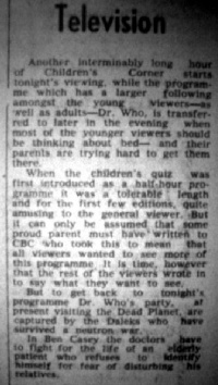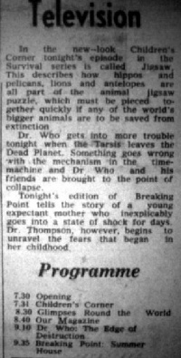 The newspapers listed not only the story titles, but also offered in the Television section brief summaries of the story-so-far and the upcoming episodes. (In these synopses, there is often amusing variations on the spelling of TARDIS, such a "Tardis", Tarsis, and Tradis.)