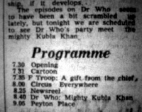 "Mighty Kubla Khan" [sic], the sixth part of Marco Polo is listed as airing on 15 July 1966, but the following week it is listed again, with a note in the paper stating that "The episodes on Dr Who seem to have been a bit scrambled up lately, but tonight we are scheduled to see Dr Who's party meet the mighty Kubla Khan" [sic]. By "scrambled", it would appear that on 15 July a completely different episode screened in error. As to what that was, is anyone's guess...