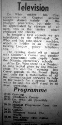 Cyprus was the 15th country to screen Doctor Who. It was the third in the Mediterranean (see Selling Doctor Who).