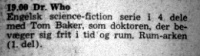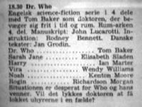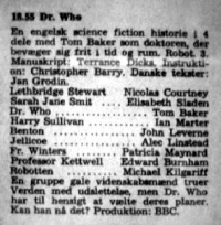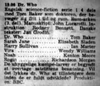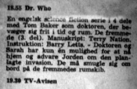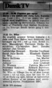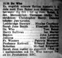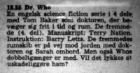 Although the above article, and those below, feature photographs of Louise Jameson (Leela), Mary Tamm (Romana) and K9, none of their stories screened in Denmark. The Doctor is cited as being a superman on the run from the evil Time Lords.