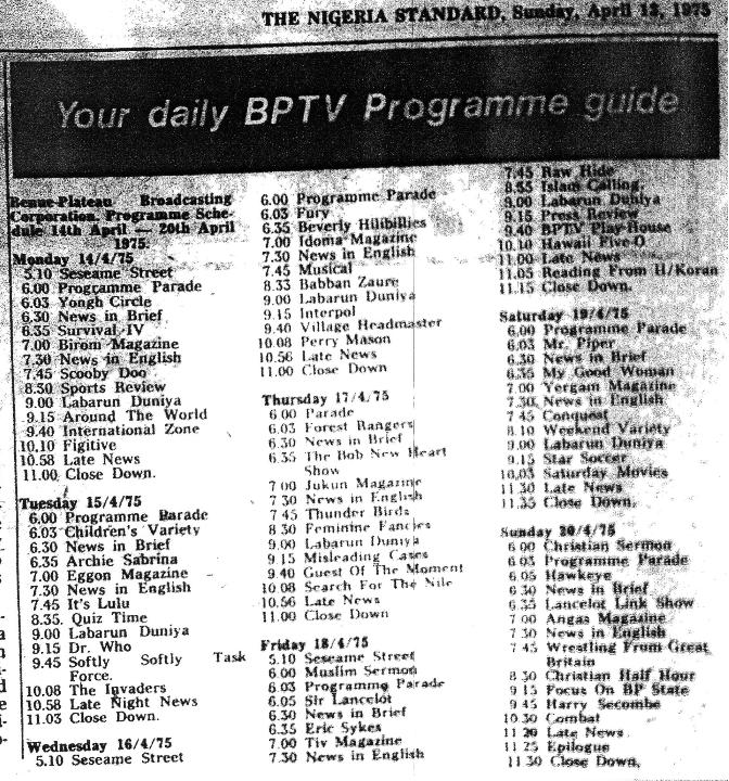 | current | 22:06, 26 September 2011 | 672 × 720 (154 KB) | Jon Preddle (talk | contribs) | TV listings from Nigeria Standard, 13 April 1975 |