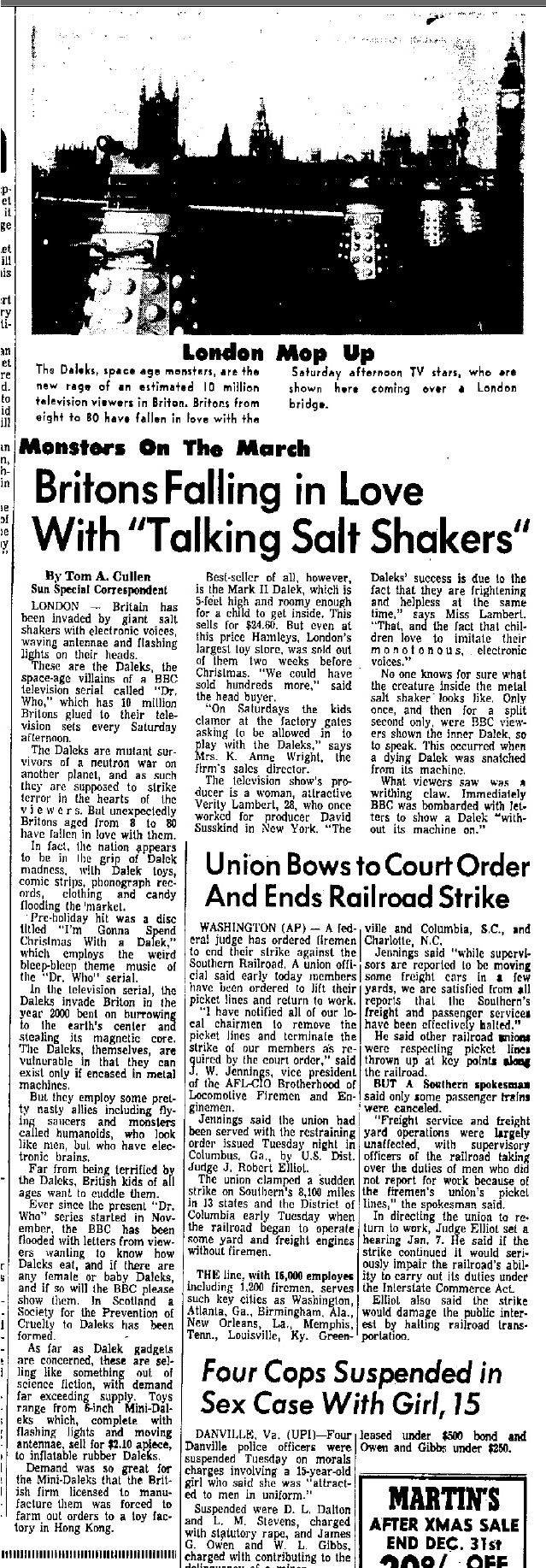 current01:11, 31 October 2015Thumbnail for version as of 01:11, 31 October 20151,881 × 698 (745 KB)Jon Preddle (talk | contribs)Article about Daleks, that appeared in syndicated newspapers across US from November 1964 to January 1965