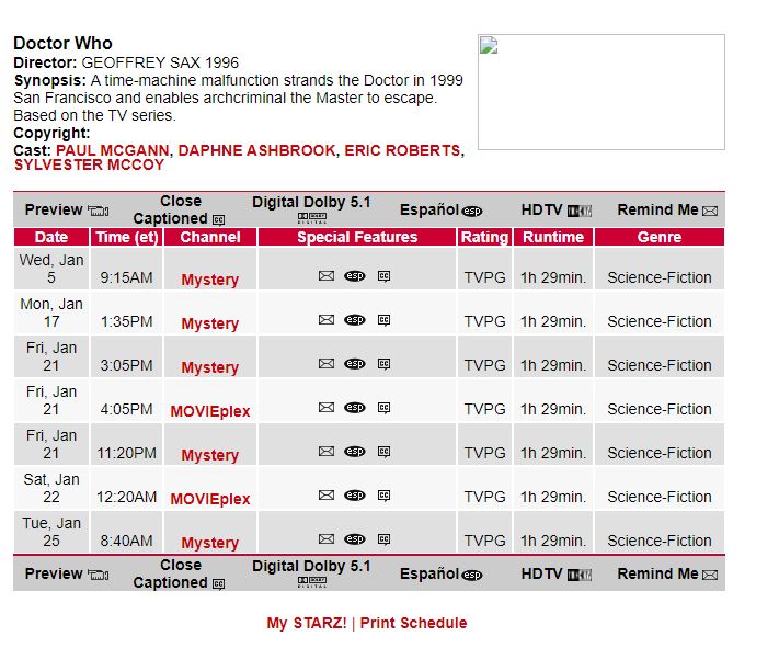 current22:11, 24 October 2020Thumbnail for version as of 22:11, 24 October 2020711 × 591 (90 KB)Jon Preddle (talk | contribs)Starz Jan 2005 schedule / WayBack Machine