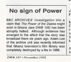 Two issues later, DWB #107 (November 1992) revealed that the investigation had been halted because the BBC had been informed "that Ghana television's film library was completely destroyed by a fire in 1989".