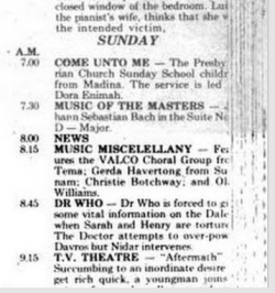 In the Ghana Daily Graphic, the first listed airdate for Doctor Who was on Monday, 11 July 1966, at 9.30pm. Six weeks later, on 15 August 1966, Doctor Who was still screening, but at the earlier time of 8.45pm. But no issue of the Graphic printed TV listings after that date.