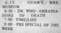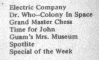 TV listings have been obtained from the issues of the Pacific Daily News. The Sunday issues also sometimes had the listings for the full upcoming week.