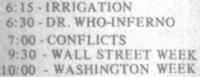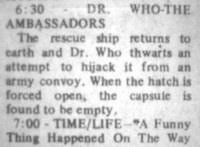 The 28 May episode is titled just "The Daleks", although this is actually Day of the Daleks. (Publicity material for this package of Pertwee stories issued by Time-Life referred to Day of the Daleks by that abbreviated title; an 'error' that many US newspapers repeated in the 1970s.)