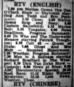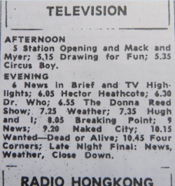 TV Listings have been obtained mainly from the South China Morning Post and the Hong Kong Standard for the 1960s and 1970s listings, and Hong Kong TV & Entertainment Times for the 1980s.
