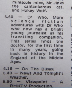 Two later TV listings – 13 and 20 July -- do not include Doctor Who – but instead have Worzel Gummidge (which ironically stars Jon Pertwee!) in the 6.05 timeslot. Since a regular series of Worzel Gummidge did indeed play later in the year, it's most likely that Doctor Who did air on these two dates instead, otherwise we would be short two episodes. (Doctor Who therefore screened at either 5.35pm or 6.05pm on those two dates.)