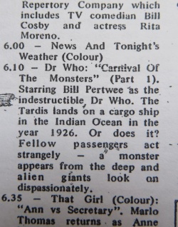 Only the Hong Kong Standard identifies the stories that aired in 1974, with "Carnival of the Monsters" [sic] given for all four parts of that story. The paper also incorrectly states that it stars "Bill Pertwee as the indestructible Dr Who"!