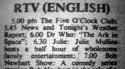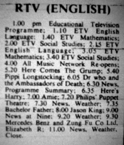The 23 April 1974 edition of the Hong Kong Standard featured a half page advertisement for RTV's English Service -- stating "Spend the night with us", and inside the first 'box' in the gallery of images was a publicity photo of Jon Pertwee.
