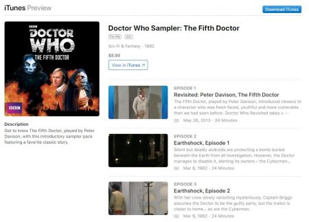 By August 2008 a very small selection of digital copies of Classic serials was also made available via the iTunes Store US, many of which had not yet been released on DVD. Only the second, third, fourth and sixth Doctors were represented. Each story cost $7.96, or individual episodes could be purchased for $1.99.