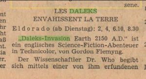 The second of the two Peter Cushing Dalek movies was shown at the Eldorado cinema in Luxembourg from Tuesday, 21 October 1969 under the usual French title "Les Daleks Envahissent la Terre". (The clipping here is from the Luxemburger Wort, a German-language newspaper.)