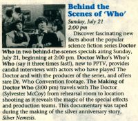 - 21 July 1991: During a summer break while Blakes 7 runs in its place, two specials air: Doctor Who's Who's Who and The Making of Doctor Who.