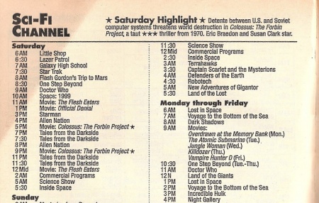 • 24 September 1992: The SCI-FI Channel launches, Thursday, 24 September, at 8.00pm (EST). Included in its regular schedules is Doctor Who, to be screened from 12.00 to 1.00pm, six days a week. The hour-long timeslot is to allow for the half-hour or 45 minute episodes to screen uncut, but with ads and short programming filling the rest of the hour. That episode was then to be repeated at 1.00am.
