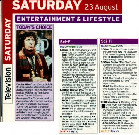 "The Doctors - 30 Years…", SF Channel Europe; The Guardian, 28 November 1998