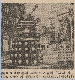 Five months prior to the series' debut on KBS, the Korean paper Dong-A Ilbo had a feature about "fearing the future", and accompanying this was a photo of two Daleks from the Peter Cushing movie "Daleks - Invasion Earth 2150 AD". The caption doesn't identify them as Daleks, just as "mechanical robots" from the BBC's "Dr. WHO."
