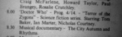 But given the track-record of the papers printing incorrect names and askew billings, there's no guarantee that the credited actors did actually feature in the listed episode – for instance, Nicholas Courtney is credited as being in Pyramids of Mars when it's clear that the cast billing for Terror of the Zygons has simply been carried over and applied to Pyramids of Mars in error, so it's just as likely that the printing of Ian Marter's names on the last six might also be an error.
