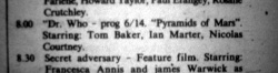 The next six episodes were not identified by title – with the billings crediting Tom Baker and Ian Marter; however both Marter and Nicholas Courtney were billed under Pyramids of Mars, so the final six episodes do not necessarily feature Ian Marter - nor Tom Baker, for that matter!
