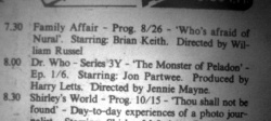 Some of the story titles are incorrect: Two episodes were billed as being "Part 3" of The Monster of Peladon, The Time Warrior was listed as "The Time Warriors" (plural) both years, and Pyramids of Mars was given in the singular. The billings also identify some of the episodes by their BBC production codes, such as "Dr Who - Series 3U – "The Time Warriors" both years, and "Dr Who Series 3Y – The Monster of Peladon" on all six in 1984.