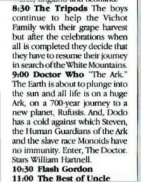 When the Omnibus aired on the New Jersey Network on 4 January 1986, it was preceded by "The Tripods", and followed by "Flash Gordon"!