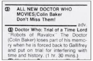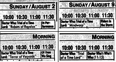 - Some of the US newspapers listed the series under the titles adopted for the novelisations, such as these ones here for KRMA in Colorado. Papers that featured listings for South Carolina Educational Television also used the alternatives in 1987.
