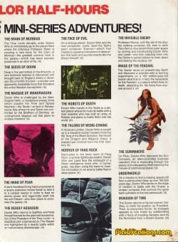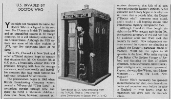 • Space Wars magazine (Vol 2/4, cover dated August 1978) carries the feature "Dr Who comes to America", but this focuses mainly on the Pertwee stories that were still airing in some States (with an episode guide, listing the 13 serials in alphabetical order) and does not mention the syndication of the Tom Baker series at all (see United States--1979 page for the magazine cover).